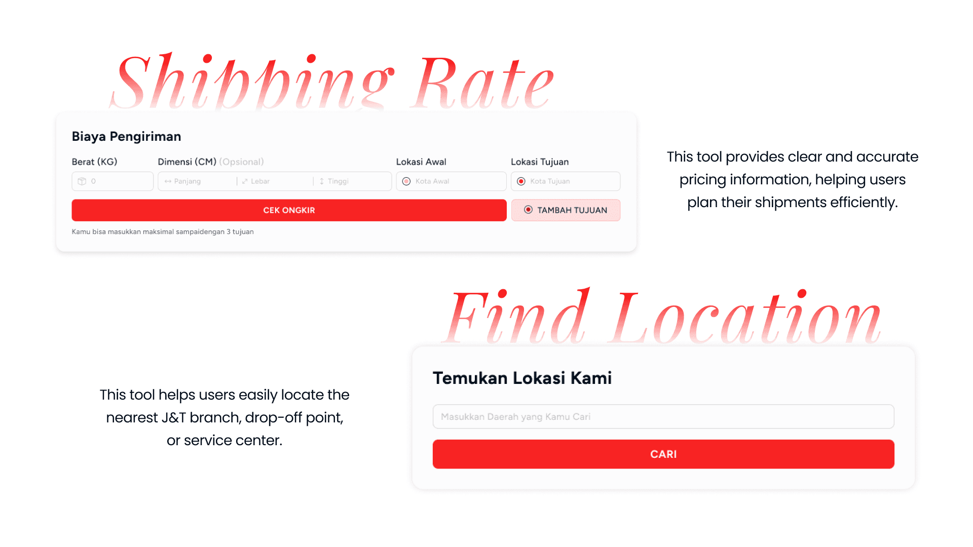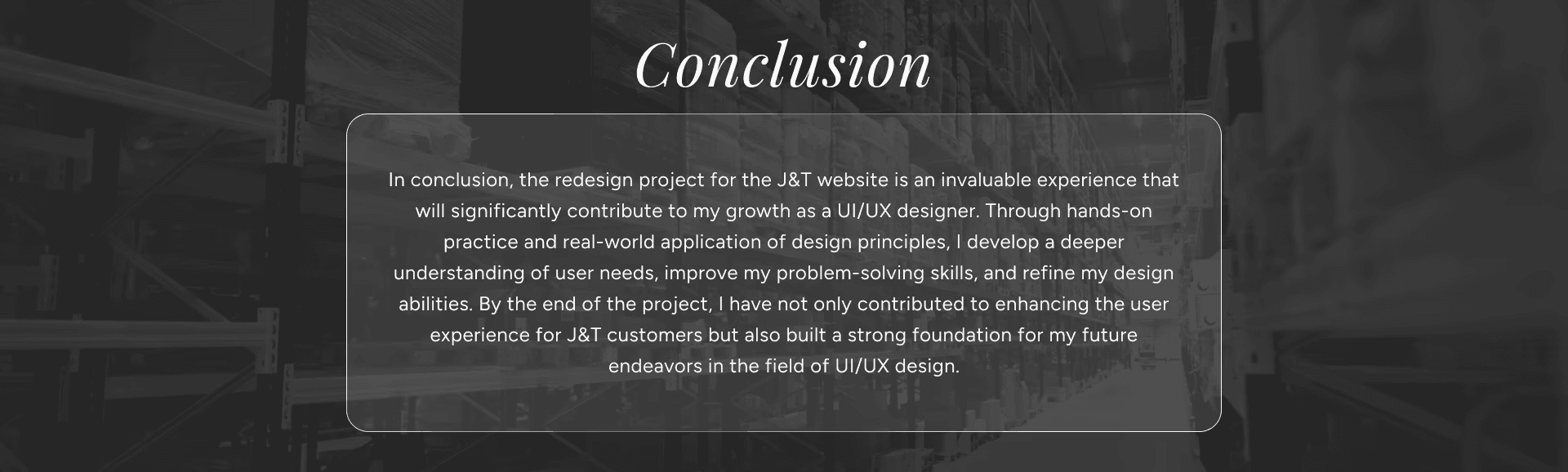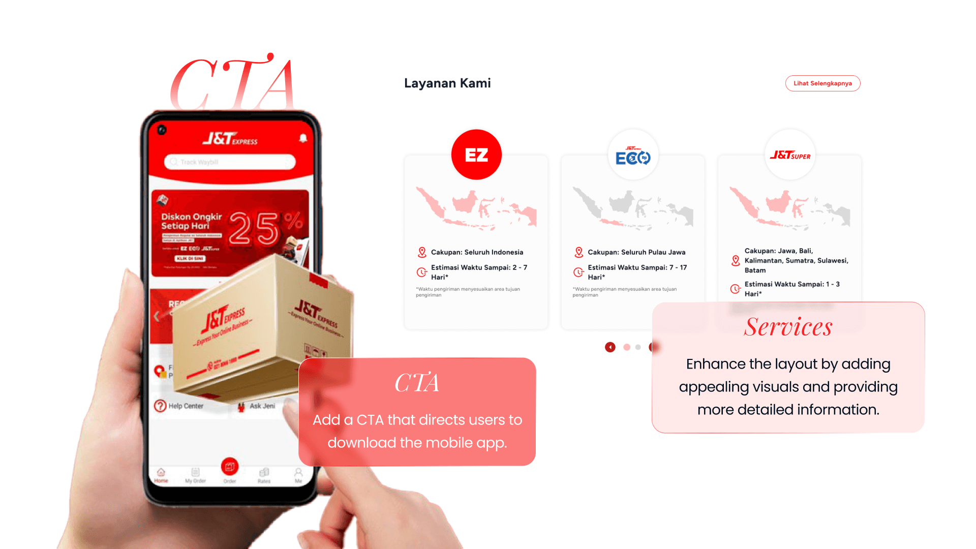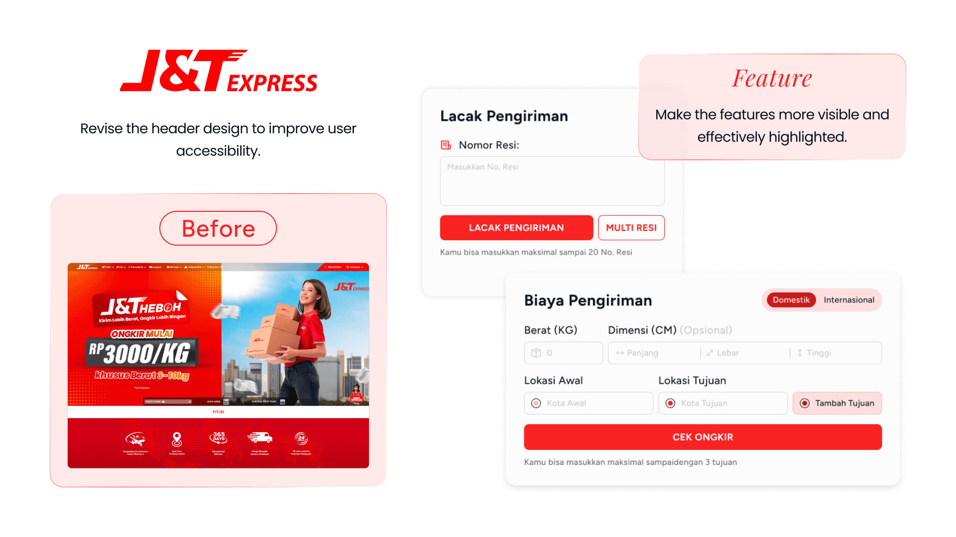 The goal of the J&T website redesign is to enhance user experience by addressing existing issues and leveraging available opportunities. 1. By placing greater emphasis on essential features, users will be able to easily find the information they are looking for. 2. By optimizing the navigation to be more intuitive, users will find it easier to browse the website, which will reduce confusion and improve efficiency in accessing the services provided.