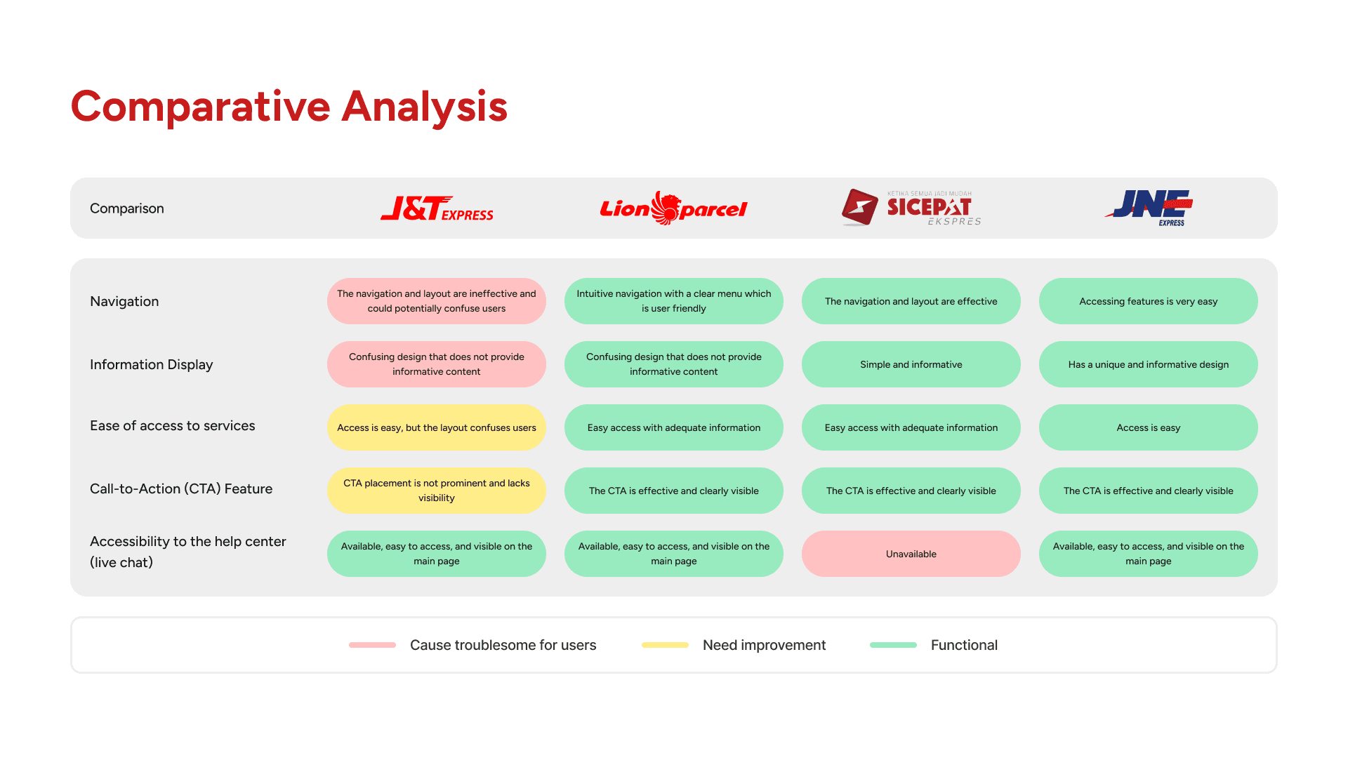 I conducted secondary research by performing a comparative analysis of competitor companies to understand the features and advantages they offer. The research revealed that Lion Parcel and JNE excel in several of their features.