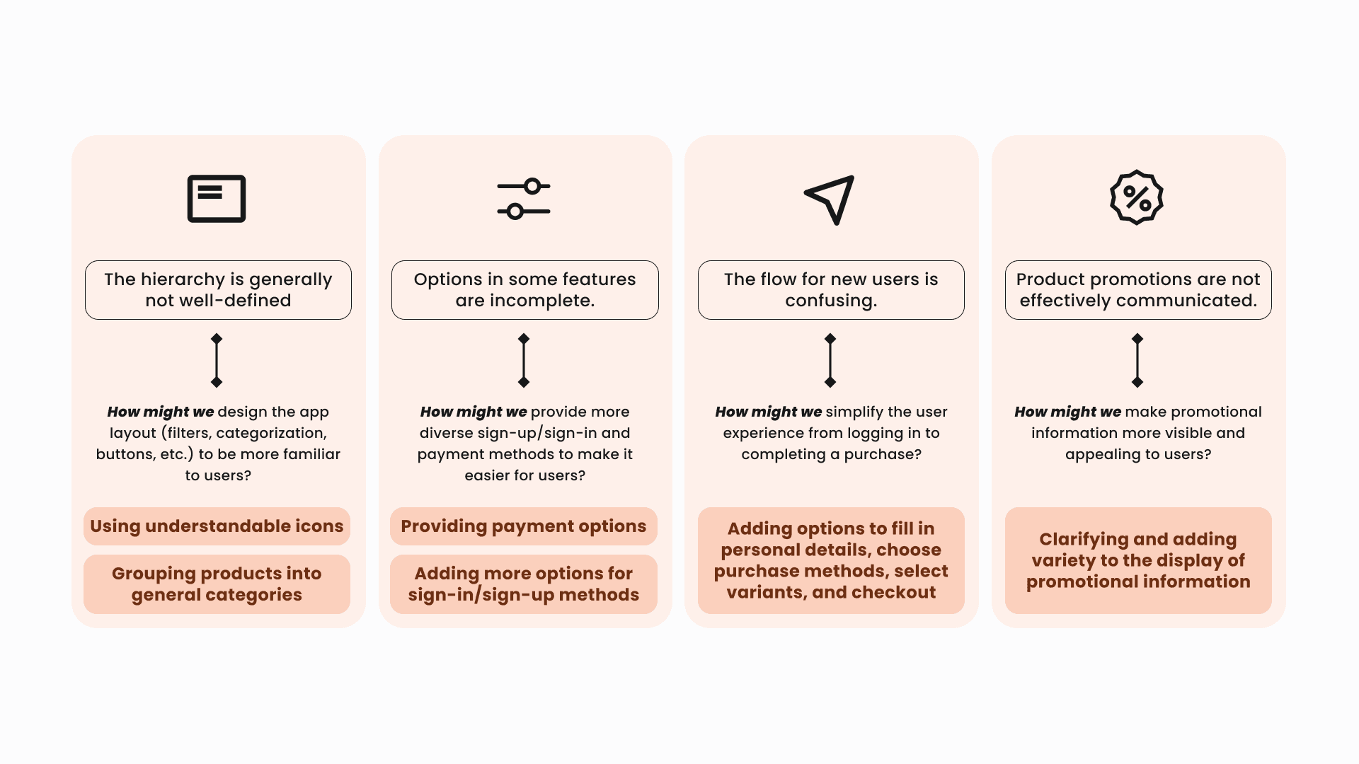 These challenges are limiting the app’s potential to drive more orders and build strong, long-term customer relationships by improving the user experience to encourage users to make a purchase and improving product categorization to prevent user confusion.